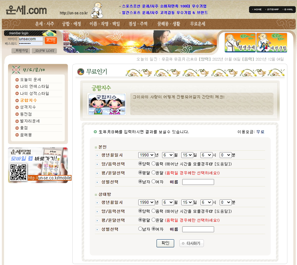 그런 궁금증도 뽐뿌 무료운세(https://www.ppomppu.co.kr/fortune/)에서 … 제공하는 사이트(http://www.unsin.co.kr/unse/saju/total/form)입니다.