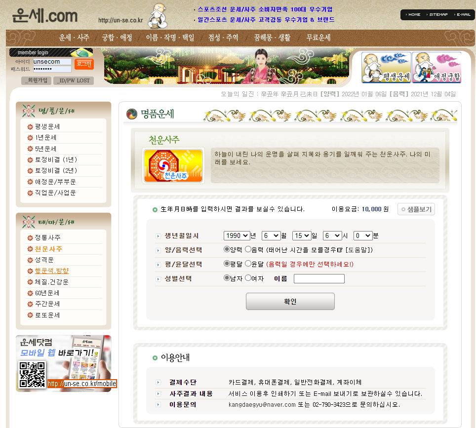 인터넷사주 길(吉)·흉(凶) 판단 무료 인터넷사주 보기 https://www.asiae.co.kr/fortune/ 사주나 운세를 풀어보고자 하는 사람들은 인터넷사주 사이트를 자주 이용한다.