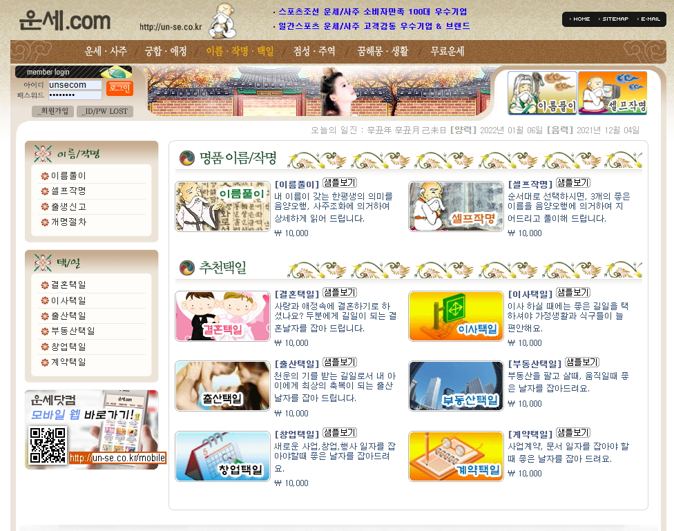 신년 운세를 보실 수 있으며 그 외 여러가지 애정운, 인생운, 사업운등 많은 운세보기가 준비되어 있습니다.